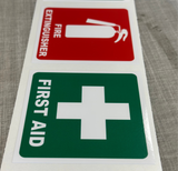 First Aid & Fire Extinguisher Sticker , self adhesive, waterproof, vinyl sticker for vehicle, window or sign.