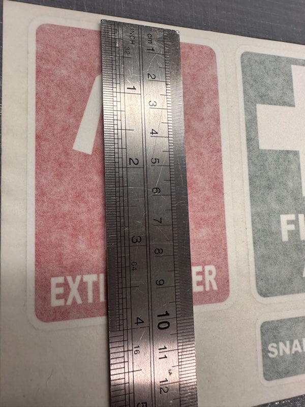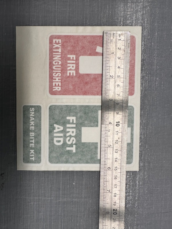 The Fire extinguisher sticker and the First Aid sticker is 70mm x 100mm
