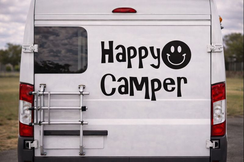 This Happy Camper decal is a fun, bold statement for anyone who loves life on the road, weekends away, or full-time van living.