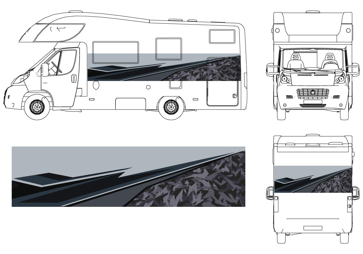 Our motorhome wrap print features a trendy black and grey camouflage pattern on high-quality vinyl with a glossy overlaminate for long-lasting vibrancy.