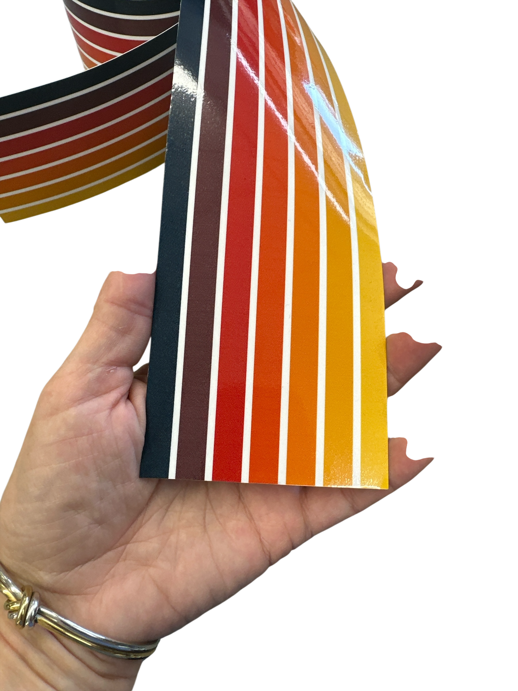Style your wheels with these vibrant, glossy pinstripes! Transform your vehicle with retro-inspired flair and add a pop of colour, with shades of orange and brown and white between the lines, Made from top-quality vinyl in Australia, each order contains a single stripe that can be joined with an overlapping seam. Ordering from us is a breeze—RVs, campervans, trailers, cars, and glass doors can all be spruced up with these eye-catching decals. Plus, you can get custom orders created—simply message us for a quote!
